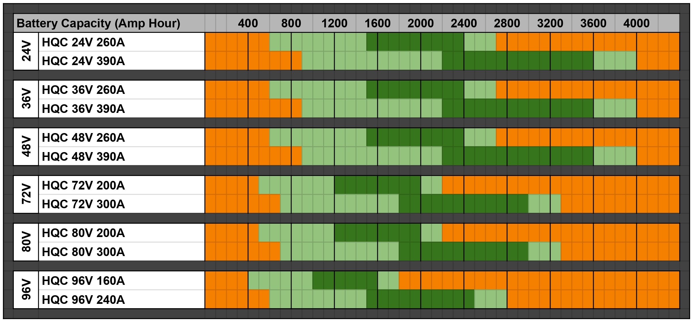 The orange and green chart (last image in the product gallery) will assist you to select your required Battery Charger. Simply compare your Electric Forklift Battery Capacity (Ah) at the top of the chart with your Battery Voltage (24V, 36V, 48V or 80V) on the side of the chart to determine your Battery Charger model. Light green indicates that the charger is ‘suitable’ and dark green indicates that the battery charger is ‘ideal’ for your particular electric forklift.
